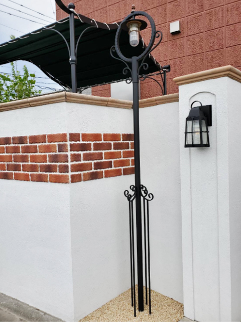 ガーゴイル魔除け、アイアンの門扉(LIXIL)、宅配BOX(パナ)、ポスト・マイスターポスト、自然石乱形(メイク)と樹脂舗装(四国化成リンクストーン、アプローチ階段・トラバーチン ピンク(オンリーワン 大理石)、フレンチサイクルポート(オンリーワン)、アイアン製サークル街灯/ウォールマウントライト クラシック (オンリーワン)、水栓 リリー(ディーズガーデン)、オーバードア(LIXIL・ラフィーネ)